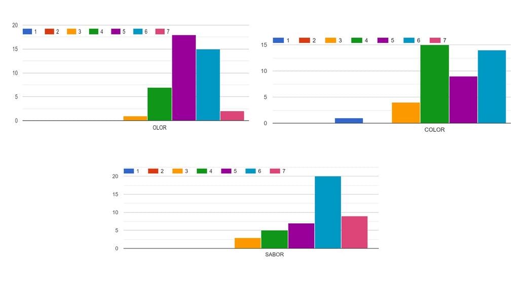 Respecto a la aceptabilidad individualizada de las características organolépticas del producto concluimos con los datos obtenidos que en la fase olfativa, mayoritariamente ha gustado ligeramente, en la fase visual ni a gustado ni a disgustado, mientras que en la fase gustativa ha gustado bastante. Nos hemos basado en una escala Likert del 1 al 7, siendo 1 «me disgusta muchísimo» y 7 «me gusta muchísimo».
