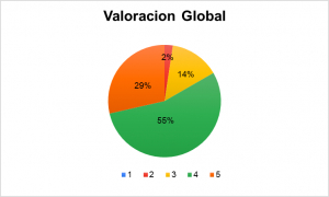 Según la valoración global, dentro de una escala Likert de 1 a 5 donde 1 es muy baja y 5 muy alta, un 54,8% de los participantes han dado una puntuación alta de 4, seguido de un 28,6% con la puntuación máxima de 5, con ello podemos concluir que la aceptación del producto ha sido bastante buena, siendo viable su comercialización.